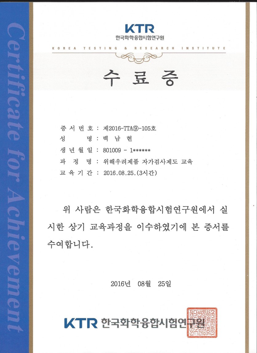 한국화학융합시험연구원 "위해우려제품" 교육 수료