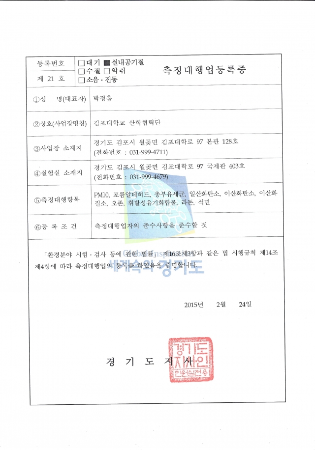 2015년 2월 24일 에이씨케이(주) 협력연구소인 김포대학교 환경보건연구소에서