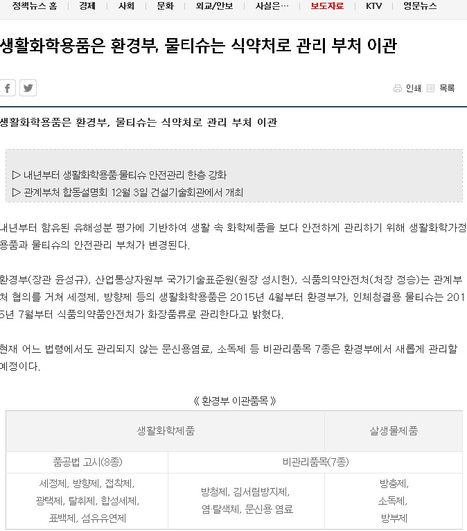세정제, 방향제 등의 생활화학용품은 2015년 4월부터 환경부가, 인체청결용 물티슈는 2015년 7월부터