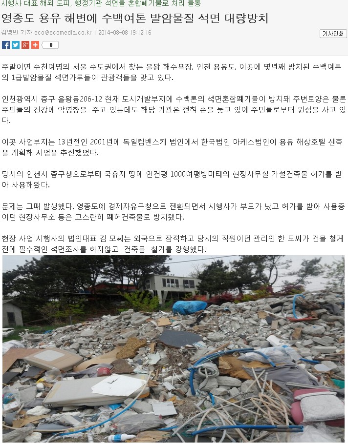 영종동 용유 해변 수백여톤 발암물질 석면 대량 방치