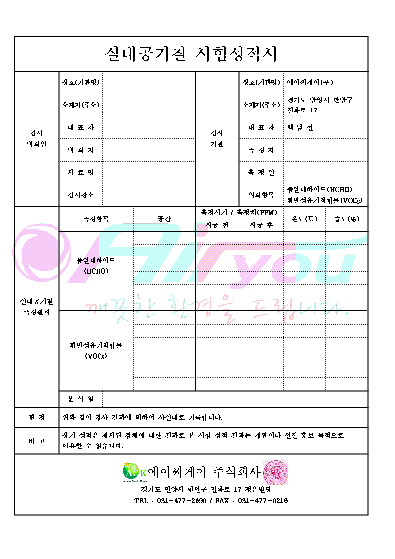 새집증후군 및 실내공기질 시험 성적서 입니다.